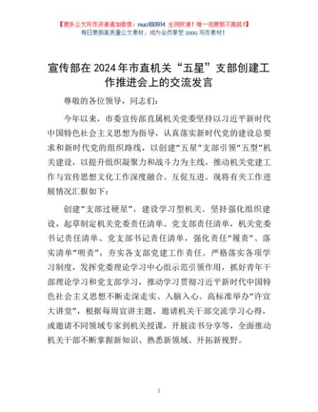 / 宣传部在2024年市直机关“五星”支部创建工作推进会上的交流发言