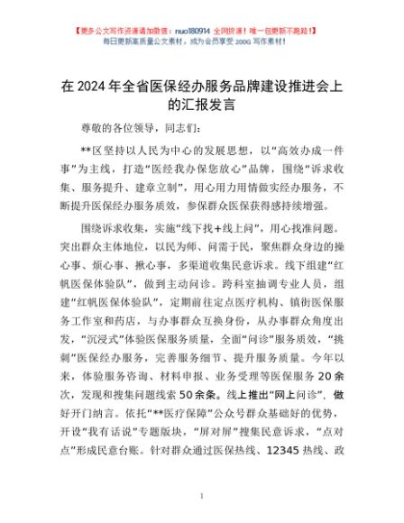 / 在2024年全省医保经办服务品牌建设推进会上的汇报发言