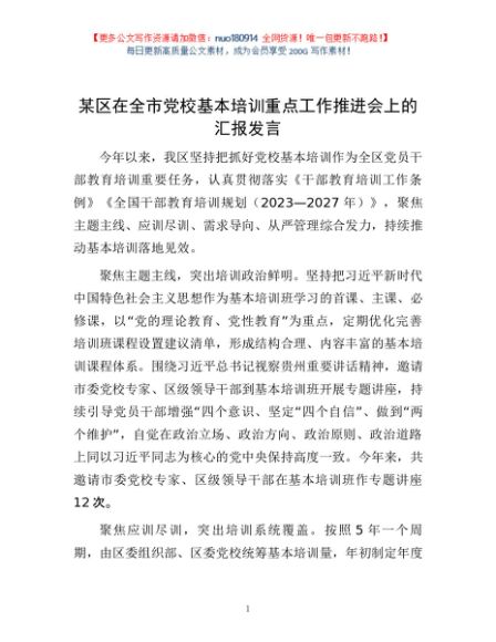 / 某区在全市党校基本培训重点工作推进会上的汇报发言