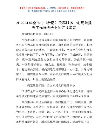/ 在2024年全市村(社区)党群服务中心规范提升工作推进会上的汇报发言
