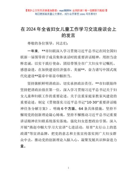 / 在2024年全省妇女儿童工作学习交流座谈会上的发言