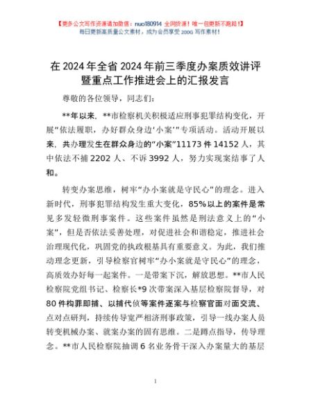 / 在2024年全省2024年前三季度办案质效讲评暨重点工作推进会上的汇报发言