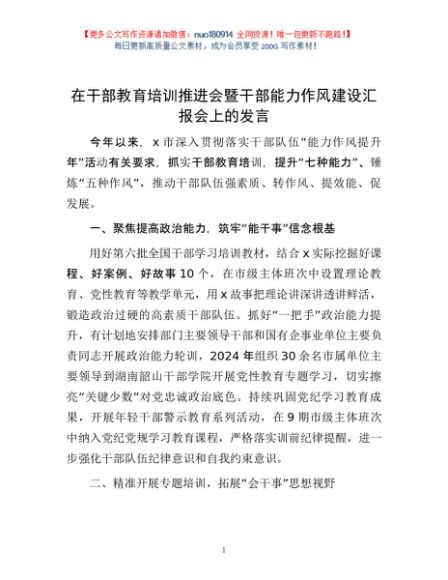 / 在干部教育培训推进会暨干部能力作风建设汇报会上的发言
