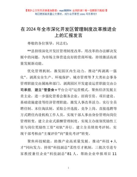 / 在2024年全市深化开发区管理制度改革推进会上的汇报发言