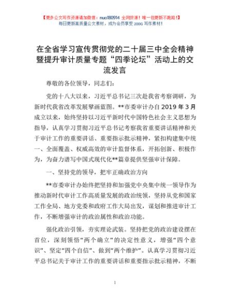 / 在全省学习宣传贯彻党的二十届三中全会精神暨提升审计质量专题“四季论坛”活动上的交流发言