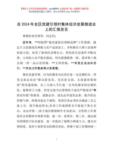 / 在2024年全区党建引领村集体经济发展推进会上的汇报发言