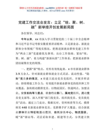 / 党建工作交流会发言:立足“统、聚、树、融”新举措 开创发展新局面