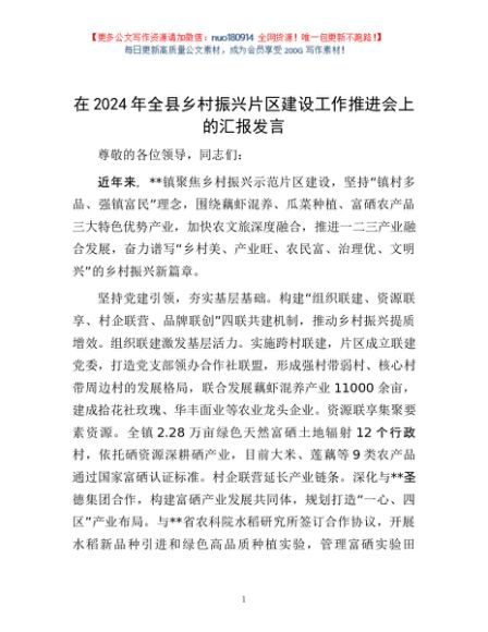 / 在2024年全县乡村振兴片区建设工作推进会上的汇报发言