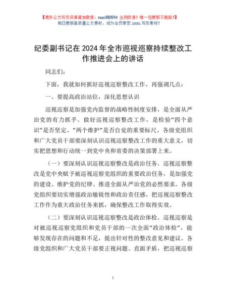 / 纪委副书记在2024年全市巡视巡察持续整改工作推进会上的讲话