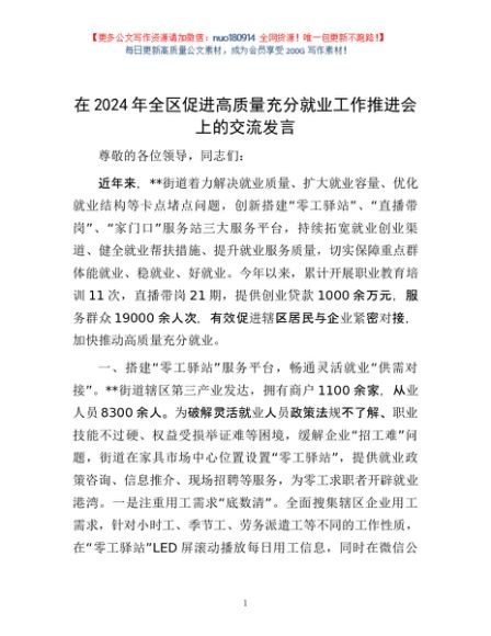 / 在2024年全区促进高质量充分就业工作推进会上的交流发言