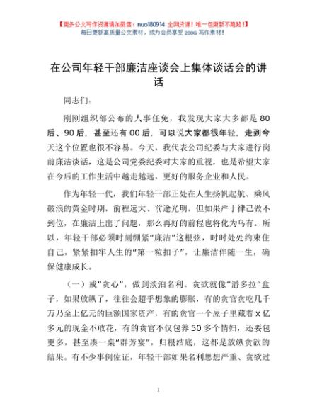 / 在公司年轻干部廉洁座谈会上集体谈话会的讲话