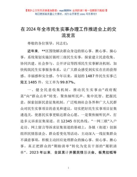 / 在2024年全市民生实事办理工作推进会上的交流发言