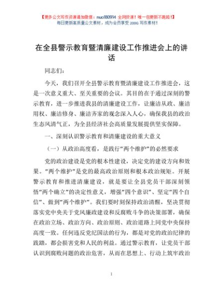 / 在全县警示教育暨清廉建设工作推进会上的讲话
