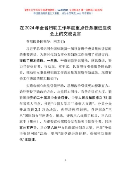 / 在2024年全省妇联工作年度重点任务推进座谈会上的交流发言