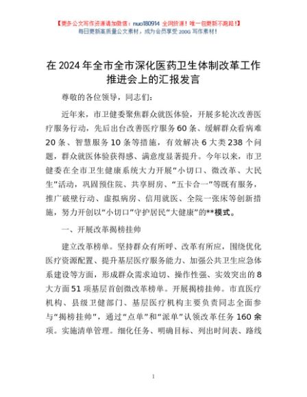 / 在2024年全市全市深化医药卫生体制改革工作推进会上的汇报发言