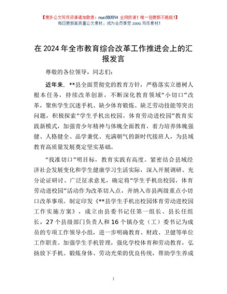 / 在2024年全市教育综合改革工作推进会上的汇报发言