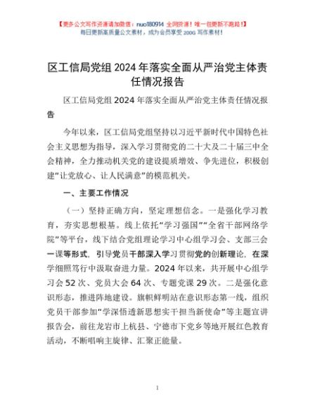 / 区工信局党组2024年落实全面从严治党主体责任情况报告