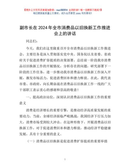 / 副市长在2024年全市消费品以旧换新工作推进会上的讲话