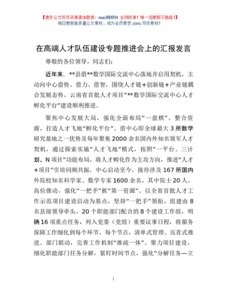 / 在高端人才队伍建设专题推进会上的汇报发言