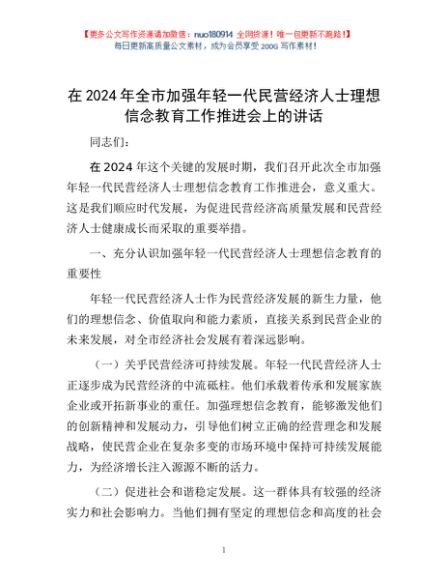 / 在2024年全市加强年轻一代民营经济人士理想信念教育工作推进会上的讲话