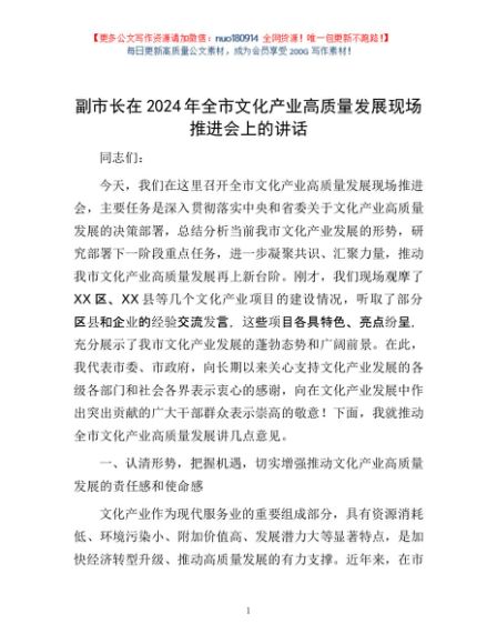 / 副市长在2024年全市文化产业高质量发展现场推进会上的讲话