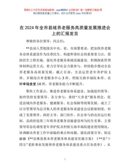 / 在2024年全市县域养老服务高质量发展推进会上的汇报发言