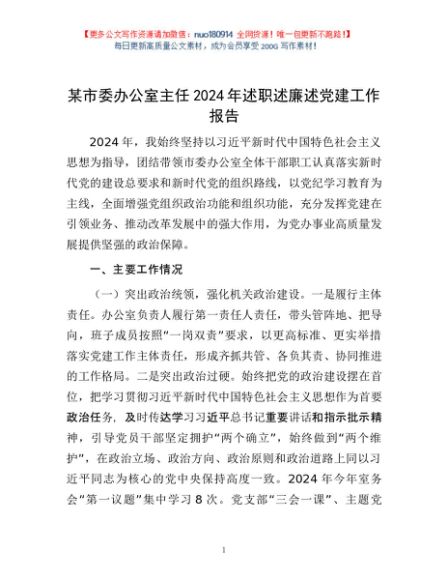 / 某市委办公室主任2024年述职述廉述党建工作报告