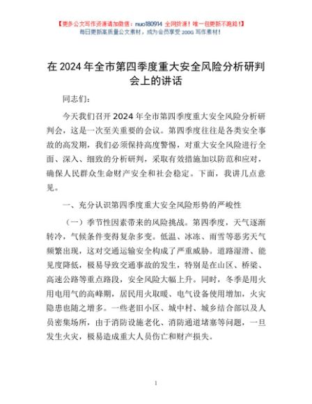 / 在2024年全市第四季度重大安全风险分析研判会上的讲话