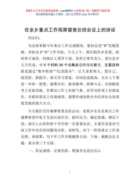 / 在全乡重点工作观摩督查总结会议上的讲话