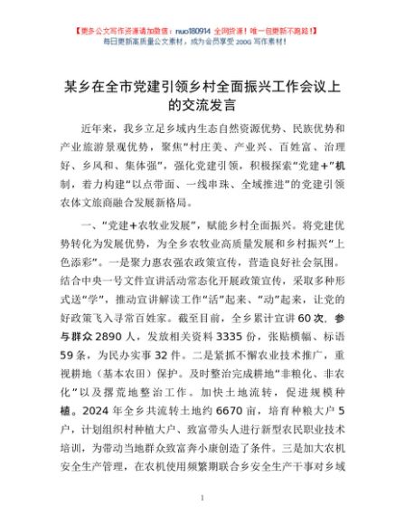 / 某乡在全市党建引领乡村全面振兴工作会议上的交流发言