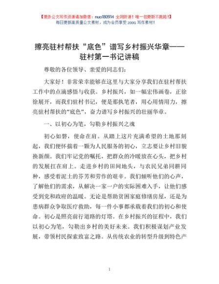 擦亮驻村帮扶 “底色” 谱写乡村振兴华章——驻村第一书记讲稿