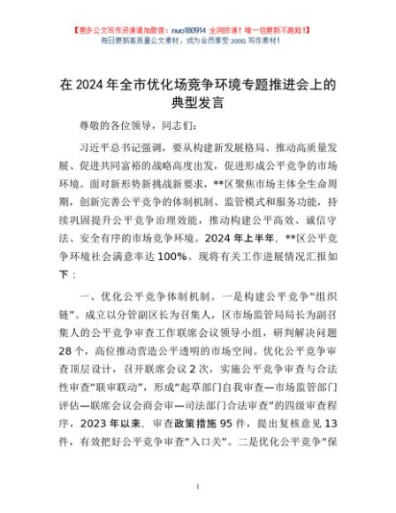 / 在2024年全市优化场竞争环境专题推进会上的典型发言