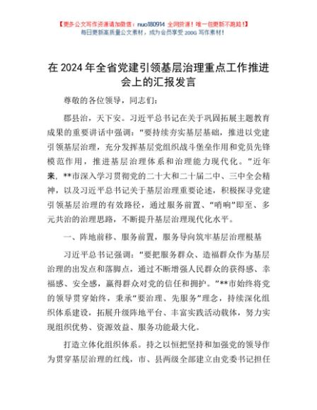 / 在2024年全省党建引领基层治理重点工作推进会上的汇报发言