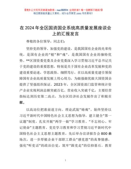 / 在2024年全区国资国企系统高质量发展座谈会上的汇报发言