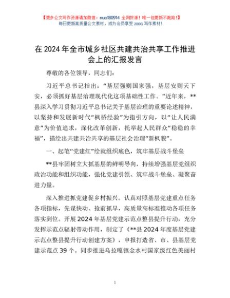 / 在2024年全市城乡社区共建共治共享工作推进会上的汇报发言
