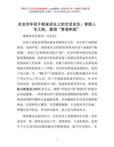 / 在全市年轻干部座谈会上的交流发言:掌稳人生之舵,激扬“青春帆船”