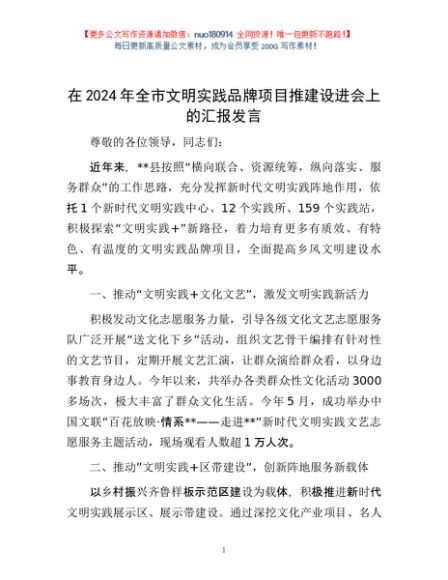 / 在2024年全市文明实践品牌项目推建设进会上的汇报发言
