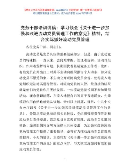 党务干部培训讲稿:学习领会《关于进一步加强和改进流动党员管理工作的意见》精神,结合实际抓好流动党员管理