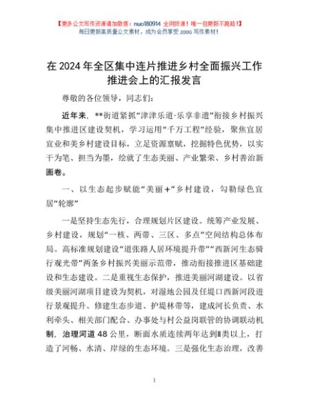 / 在2024年全区集中连片推进乡村全面振兴工作推进会上的汇报发言