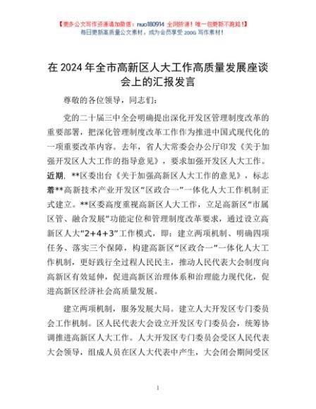 / 在2024年全市高新区人大工作高质量发展座谈会上的汇报发言