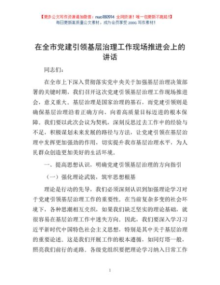 / 在全市党建引领基层治理工作现场推进会上的讲话