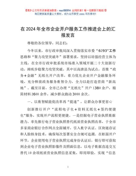 / 在2024年全市企业开户服务工作推进会上的汇报发言
