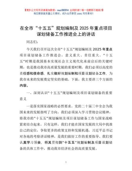 / 在全市“十五五”规划编制及2025年重点项目谋划储备工作推进会上的讲话