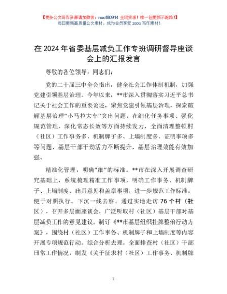 / 在2024年省委基层减负工作专班调研督导座谈会上的汇报发言