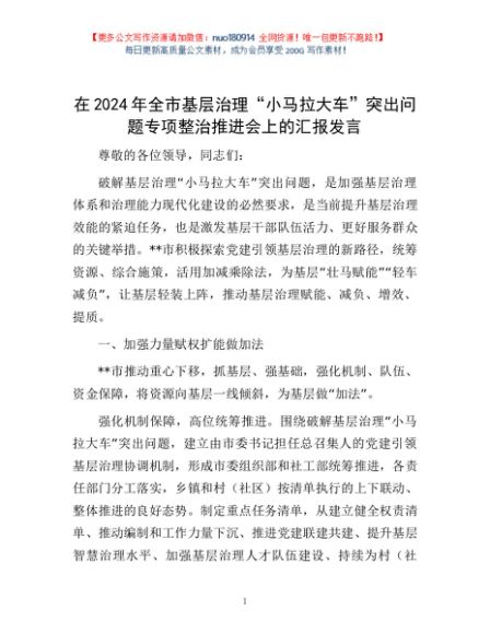 / 在2024年全市基层治理“小马拉大车”突出问题专项整治推进会上的汇报发言