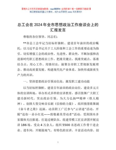 / 总工会在2024年全市思想政治工作座谈会上的汇报发言