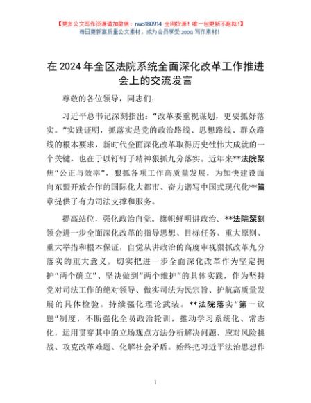 / 在2024年全区法院系统全面深化改革工作推进会上的交流发言