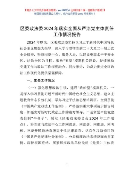 / 区委政法委2024年落实全面从严治党主体责任工作情况报告