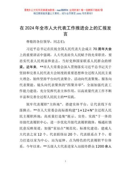 / 在2024年全市人大代表工作推进会上的汇报发言