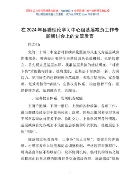 / 在2024年县委理论学习中心组基层减负工作专题研讨会上的交流发言